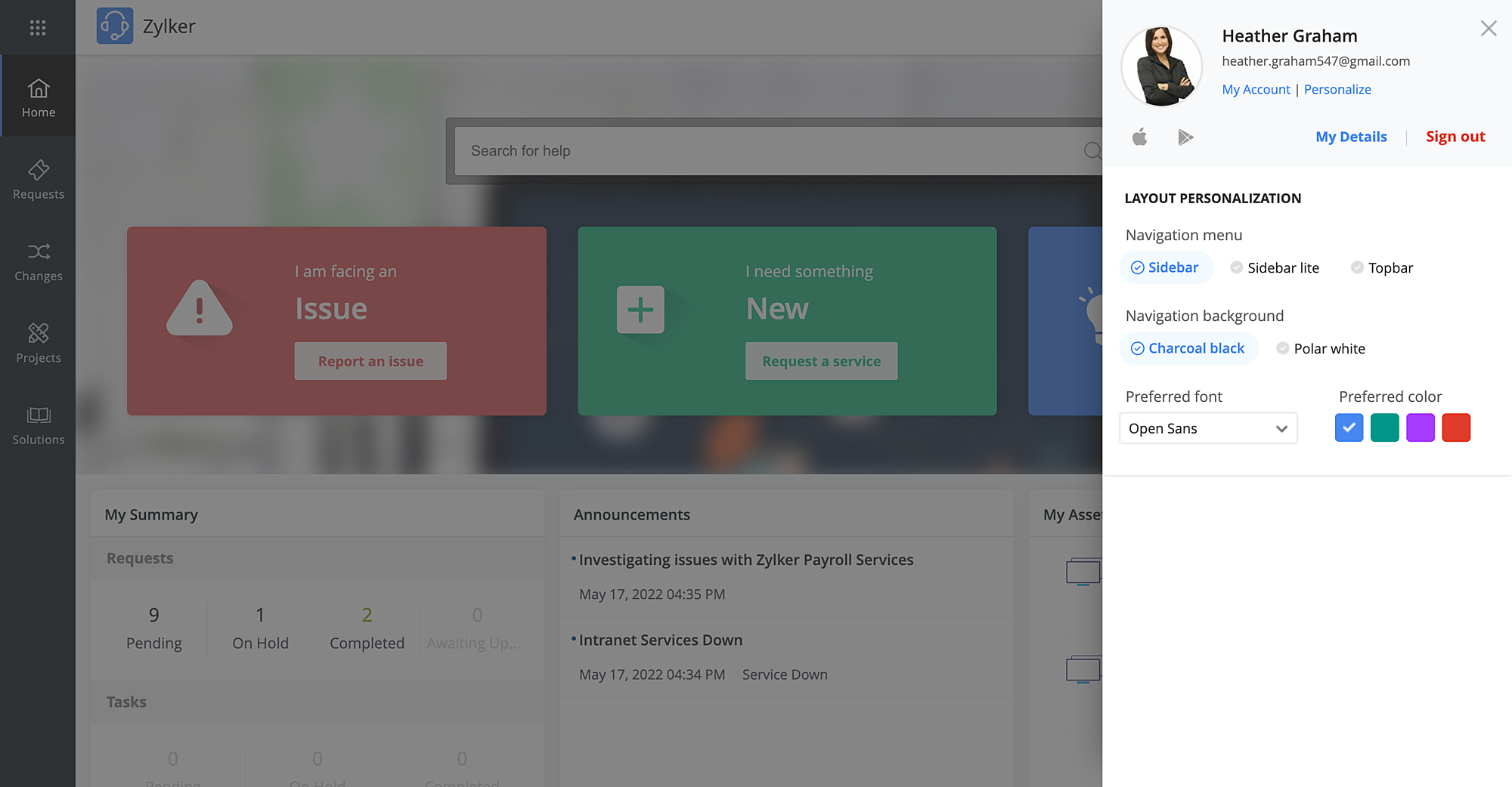 You can set the position and background color of the navigation menu, font and theme color of the help desk from the Layout Personalization section in the Personalization Settings menu.