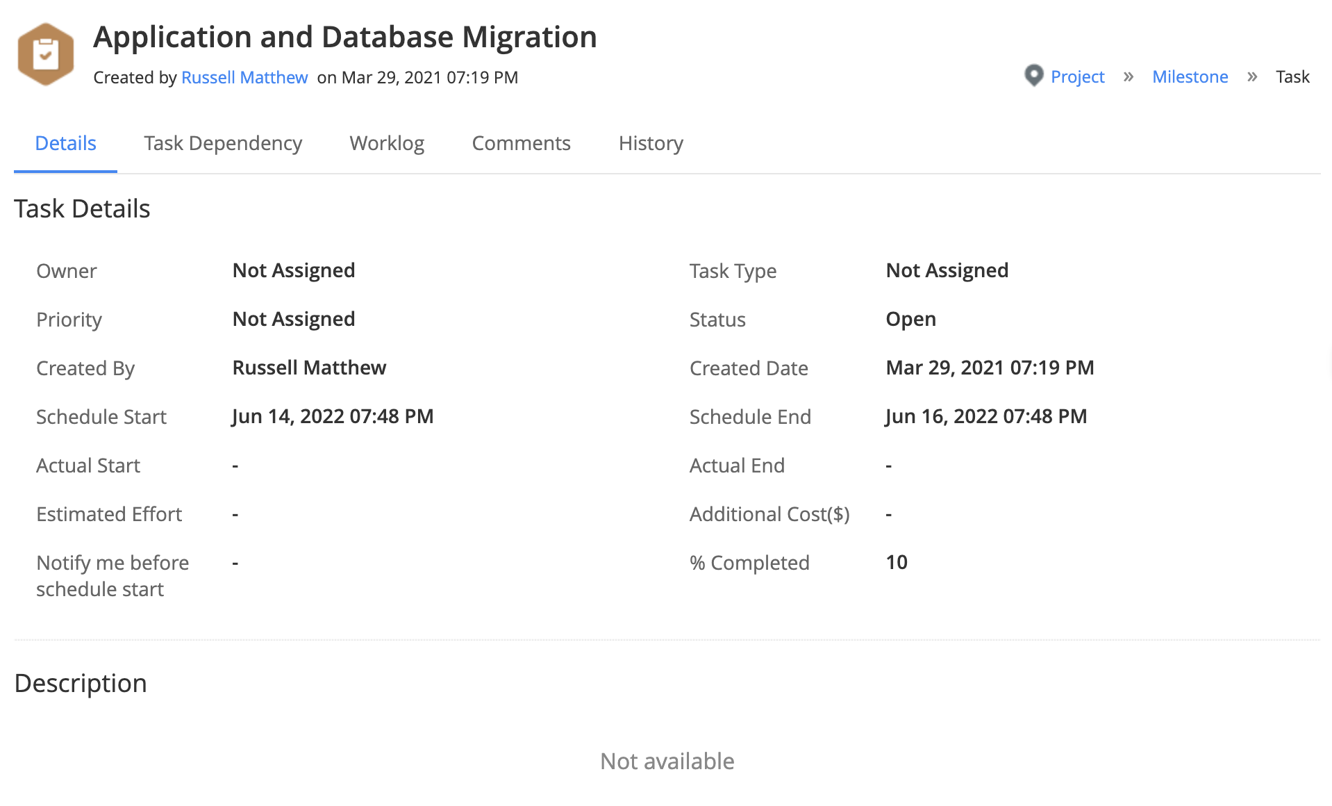 Tasks: After adding a milestone, you can break down the milestone into smaller pieces of work as tasks. You can either add tasks under Tasks or use the Actions drop-down. In addition, you can sequence tasks using Task Dependency.