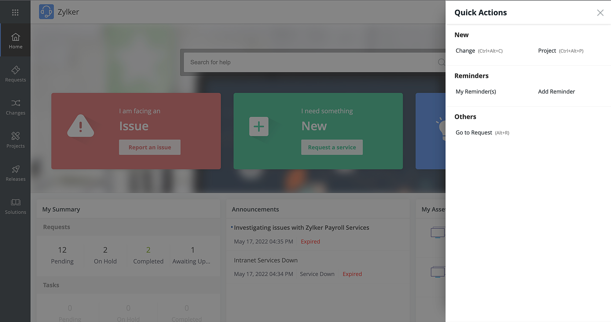 Quick Actions allow you to create change/project, manage reminders, and navigate to any request instantly. Though these operations can be performed in their respective modules, Quick Actions serve as an instant alternative mode that can be accessed from any page in the application.