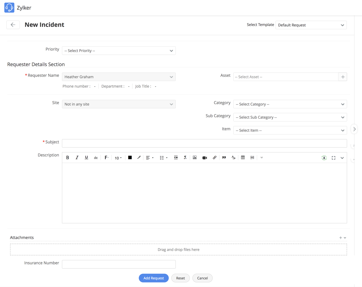 While filling out the incident request form from the header or request tab, you can reset the form details anytime using Reset at the bottom of the page.