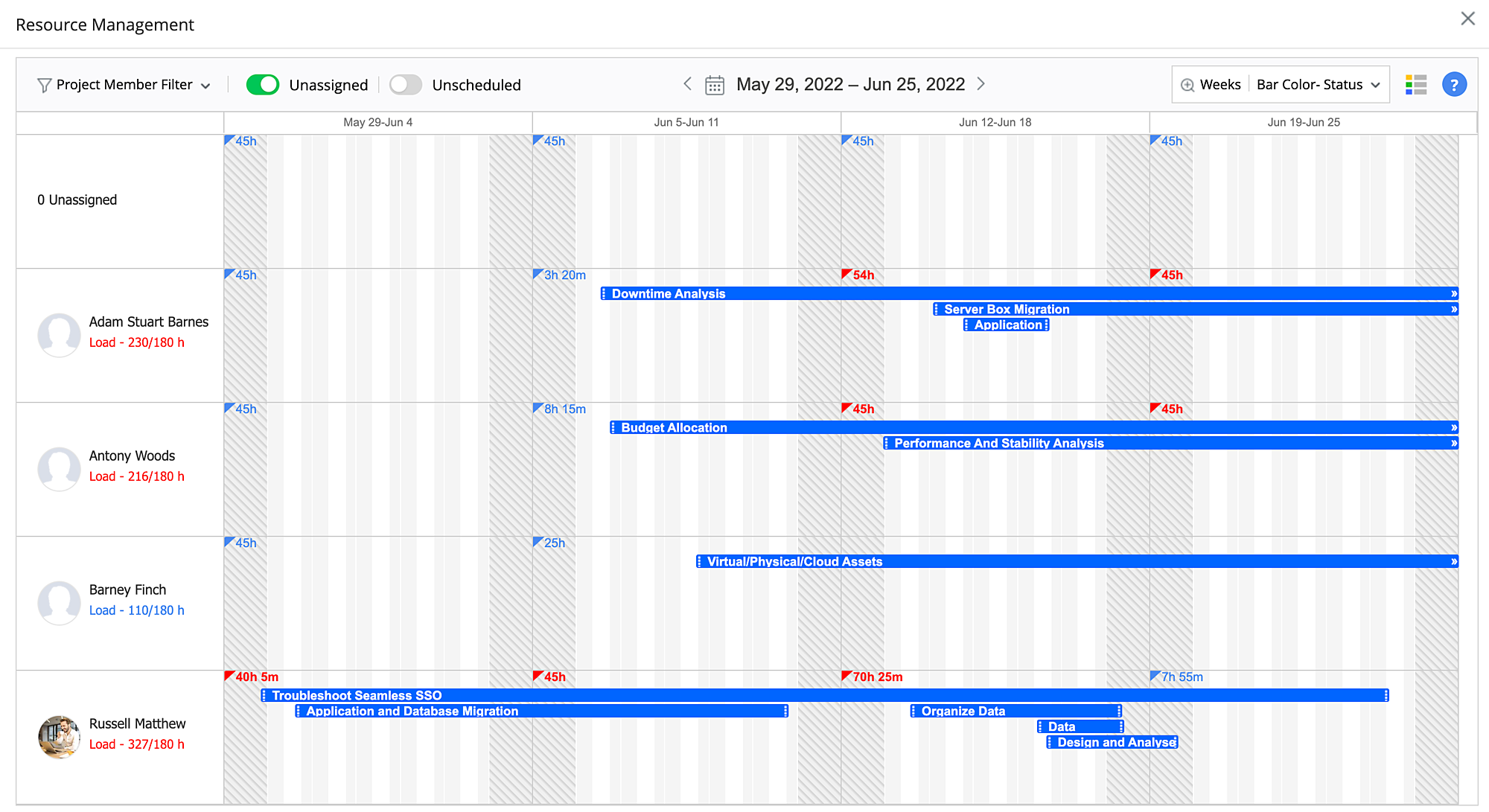 You can filter the view by project member and scheduled time. Get the list of unassigned tasks by toggling Unassigned.