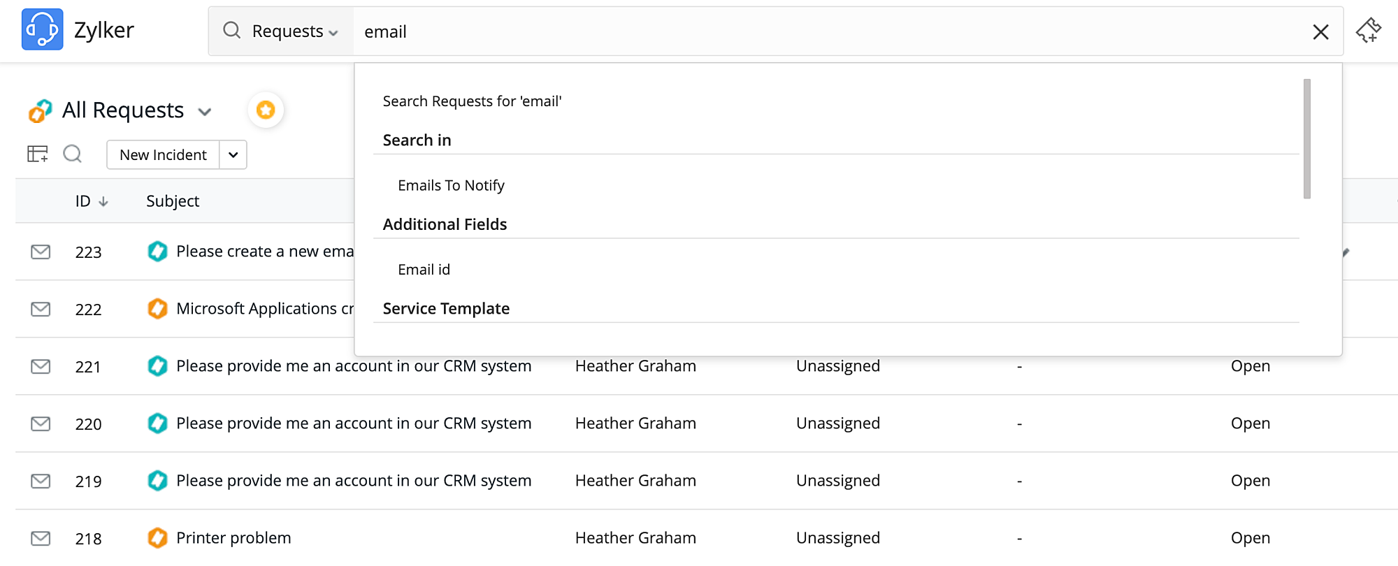 The matching configuration values are grouped and listed. For example, if you type Email, the suggestions will be listed for requests containing Email in system fields, additional fields, templates, categories, and requests.