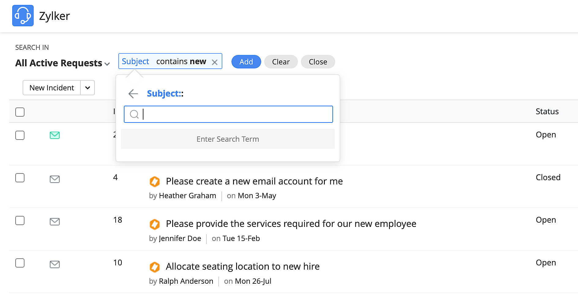 You can filter your search results by text (request ID, subject, requester’s name, or group) or date (created date, due by date, completed date, or responded date).