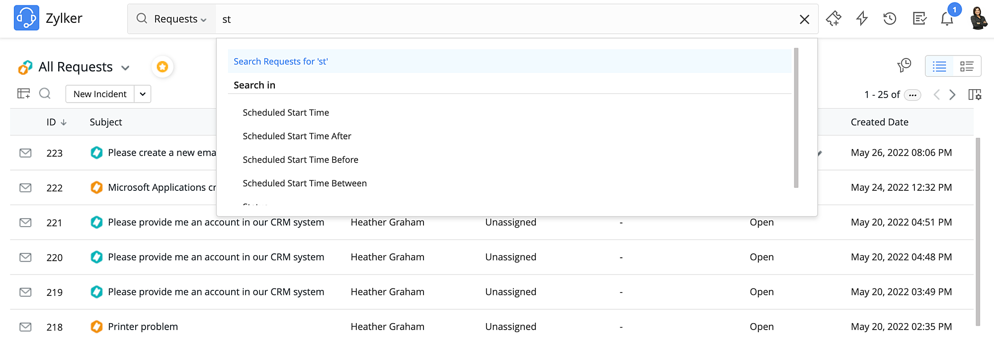 As you type your search term in the search bar, ServiceDesk Plus automatically matches your search term and displays the matching results.