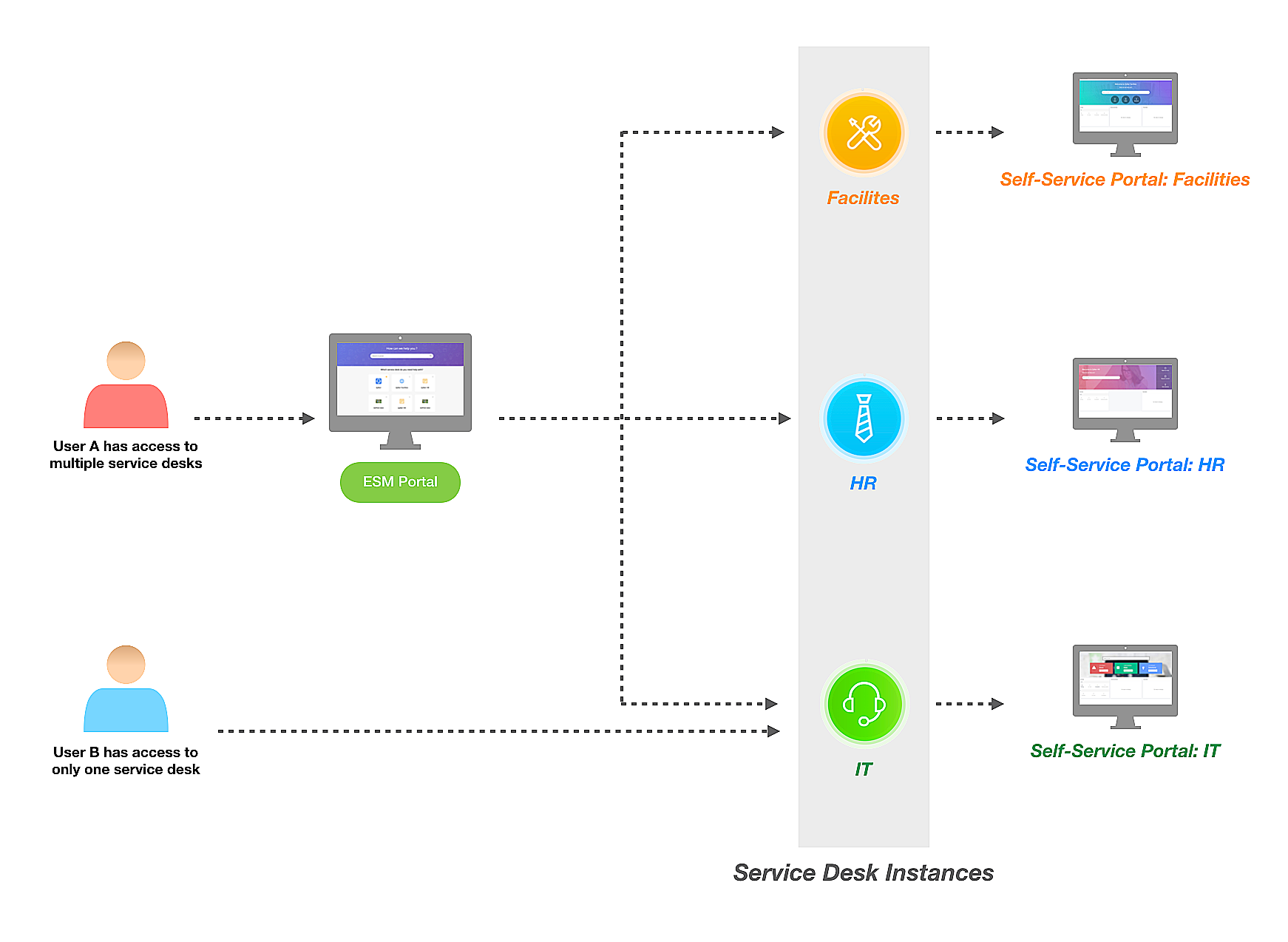Service Desk Instance - A service desk instance is created specifically for a business function like IT, HR, or Facilities to manage their service desk operations. You can use the relevant self-service portal for the service you require.